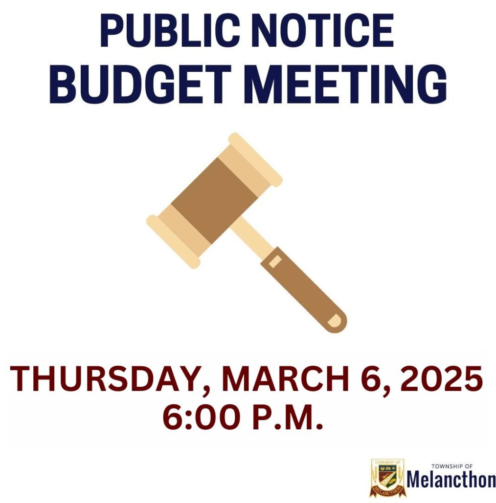 March 7, 2022 – Notice is hereby given that the Council of the Corporation of the Township of Melancthon will be holding a public budget meeting on Thursday, March 17, 2022 at 6:30 p.m. to consider the 5th draft of the Budget with the intent to adopt the Budget at that meeting.